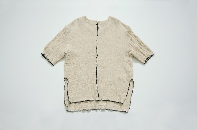 インドの職人さんが手で織った生地で制作したトップス。 ふんわりと立体感のある生地ですが、綿100%なので真夏でも快適に過ごせます。 最初からシワシワの質感なので洗いっぱなしで着られてケアが楽です。 後ろのボタンはガラスのアンティークのものを使用。 もちろんご自宅でお洗濯していただけます。 【受注制作】 ※手織りの生地を使用しているため、一着ずつ風合いが若干異なります。 ※制作スケジュール上、ご注文後のご変更はいたしかねますのでご注意ください。 color|Ecru Material|綿100%(cotton100%) Technique|手織り(Hand Woven) Made in JAPAN Size|Free 後着丈 Back length|69.5cm 身幅 Chest|54cm 肩幅 Shoulder width|41cm 袖丈Sleeve Length|29.5cm 袖口 Cuff|30.5cm モデル身長 Model height|165cm ※生地の製造特性上、糸が飛び出たように見える箇所がある場合がありますが、不良品ではありません。製品の特徴としてお楽しみください。 ※一度洗っていただくと生地が縮みますが、縮むことを想定したサイズになっております。 ※こちらに載せている写真は閲覧環境によって実物の色と異なって見える場合があります。 ※モデル着用写真は長袖のものになります。 《受注商品(予約販売)につき4月発送》 こちらは受注商品となりますので、2026年4月中の発送となります。 24200yen (26620 taxin)