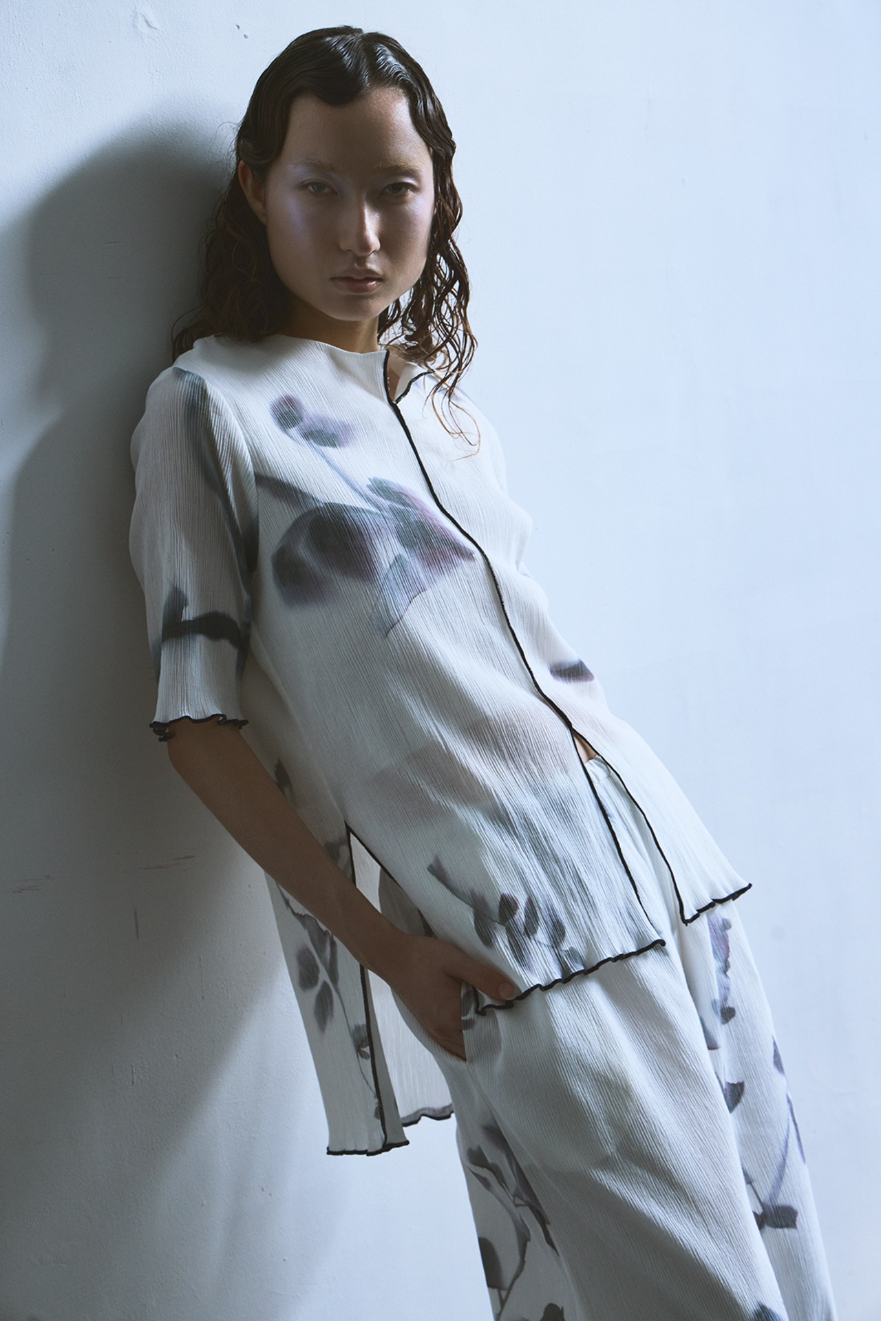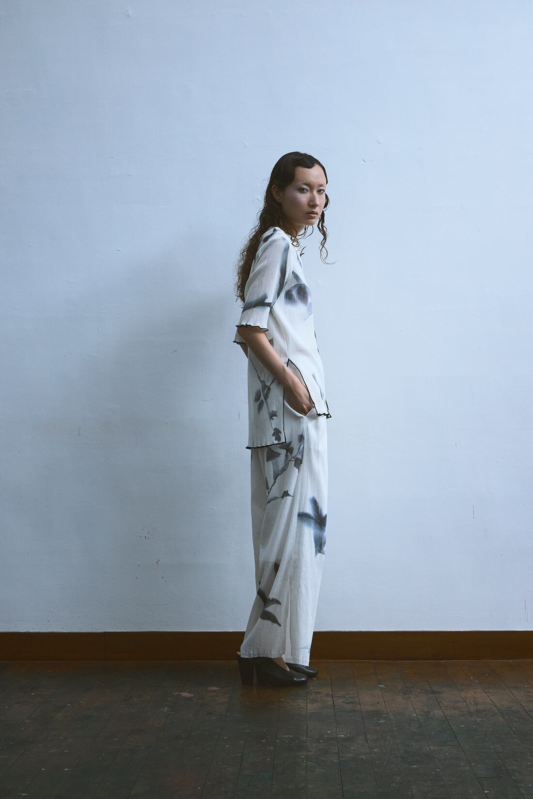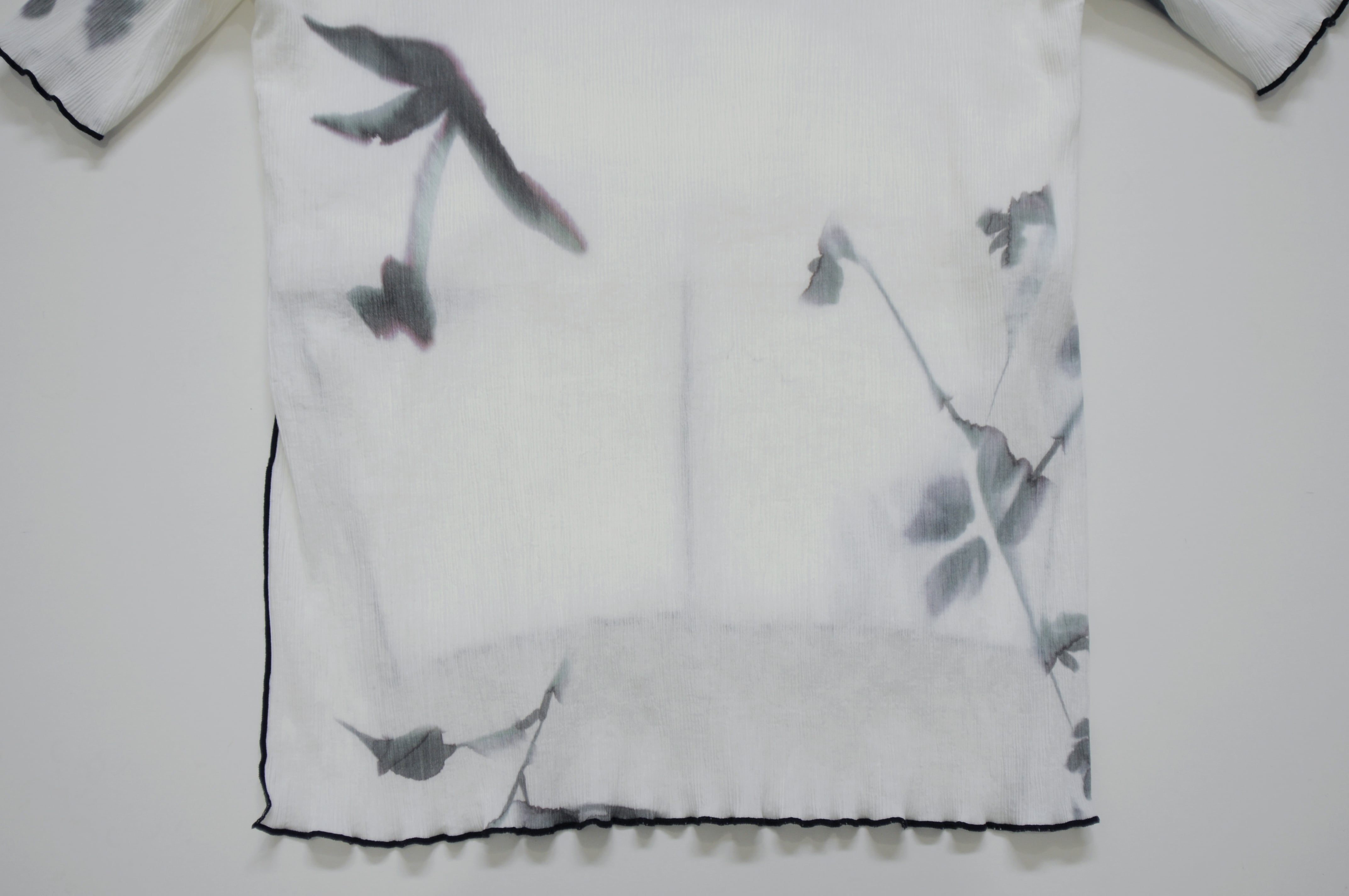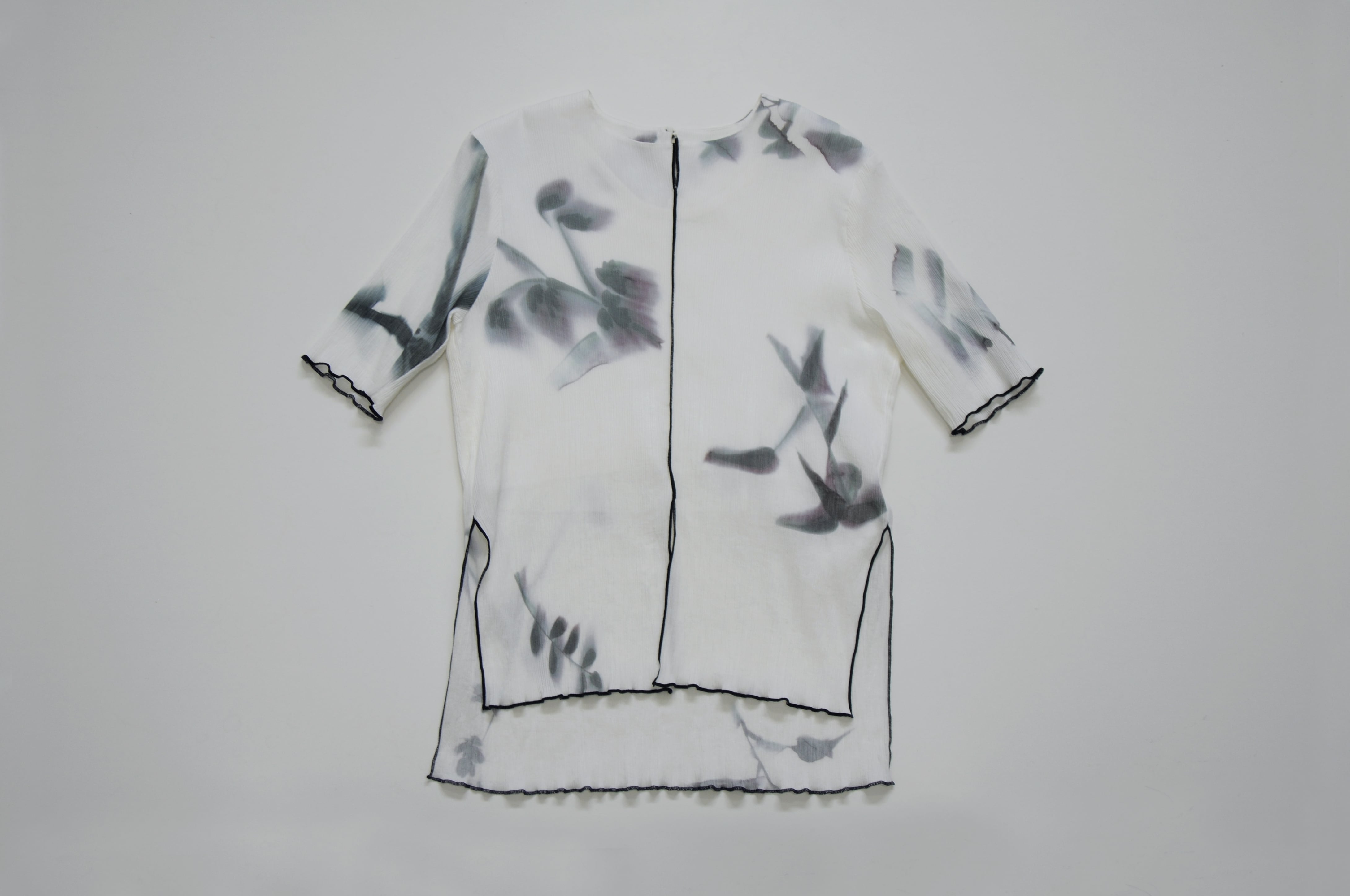 滲んだ植物柄のトップス。