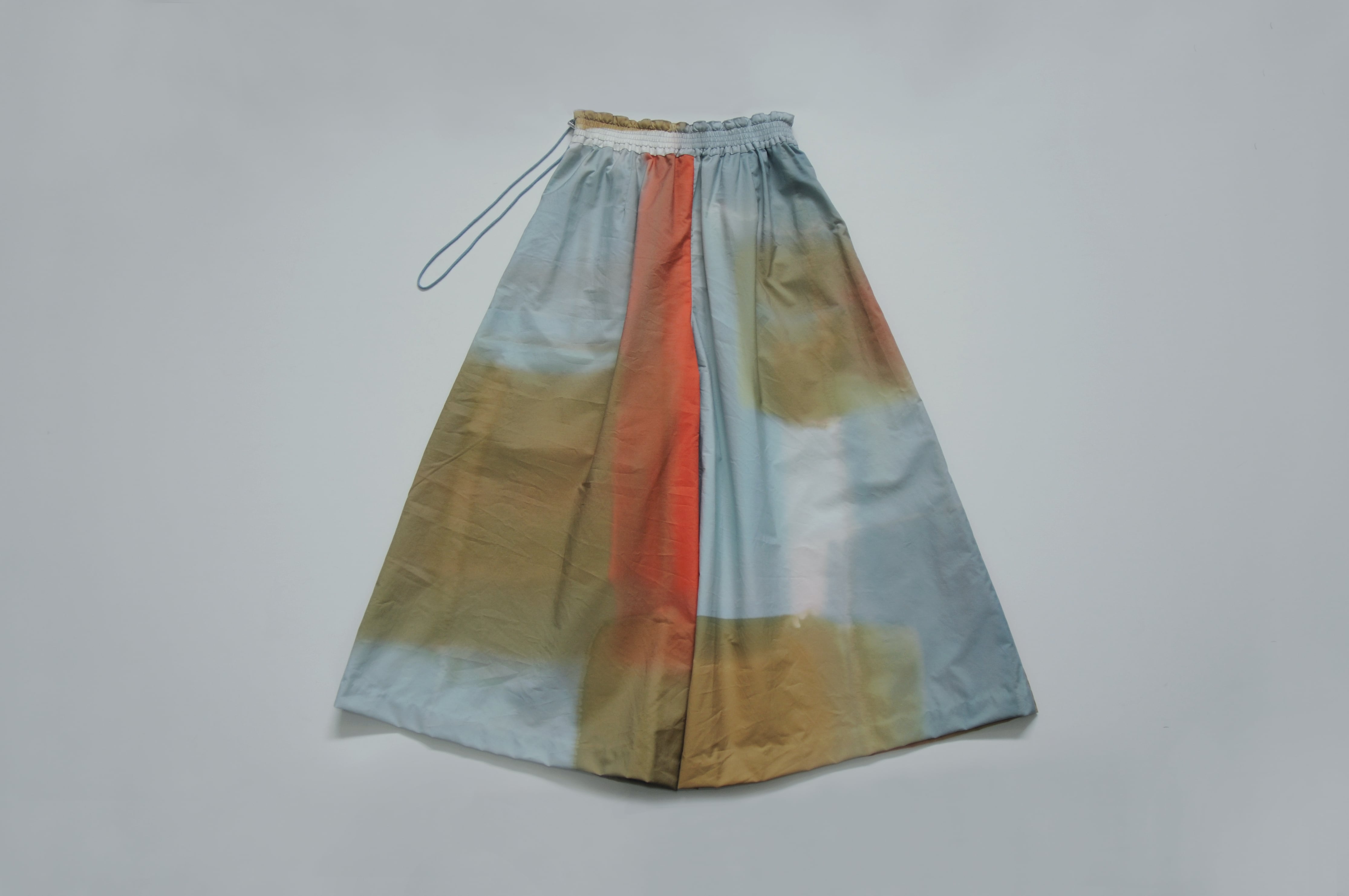 綿ナイロン生地に引き染めを施したギャザーパンツ。