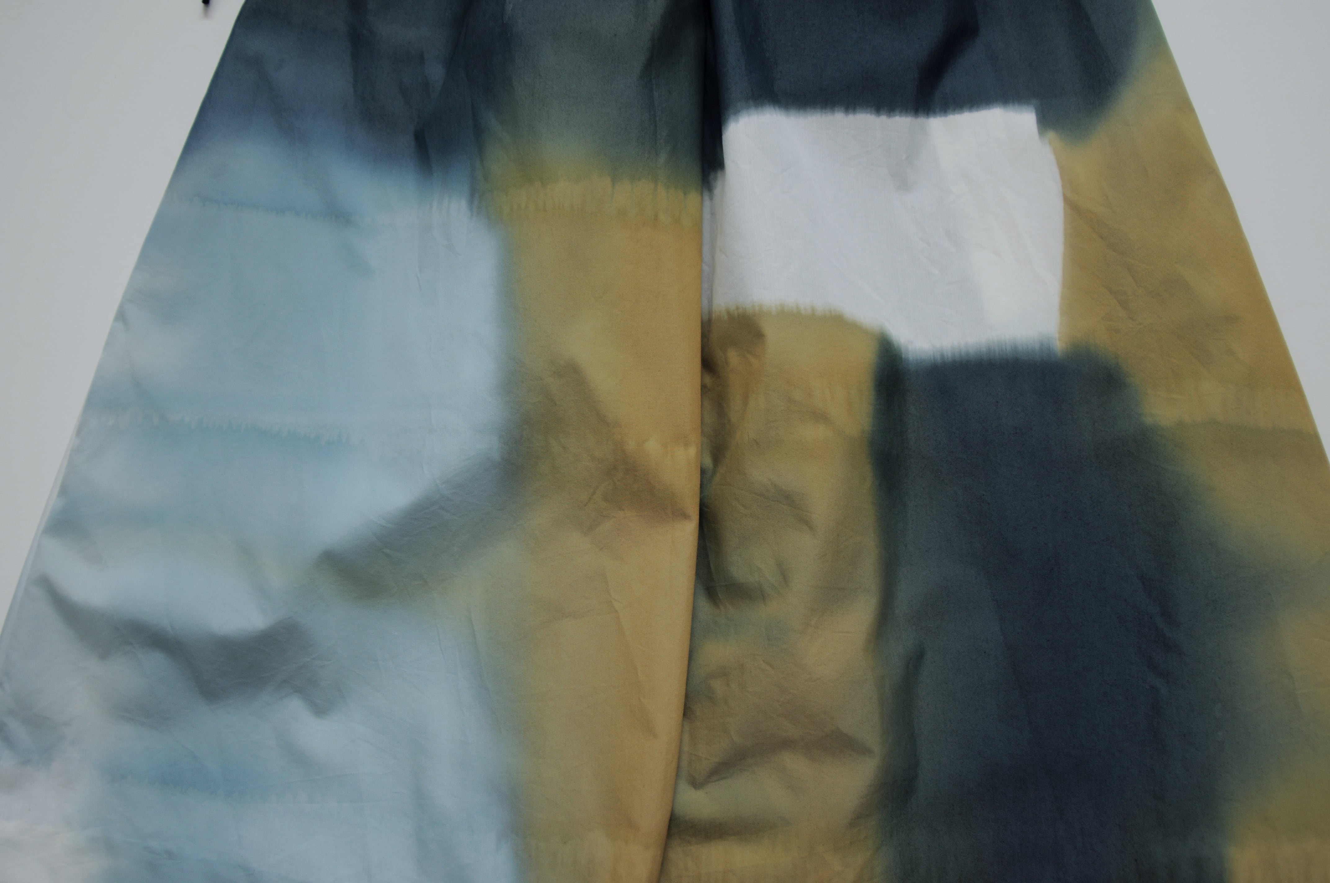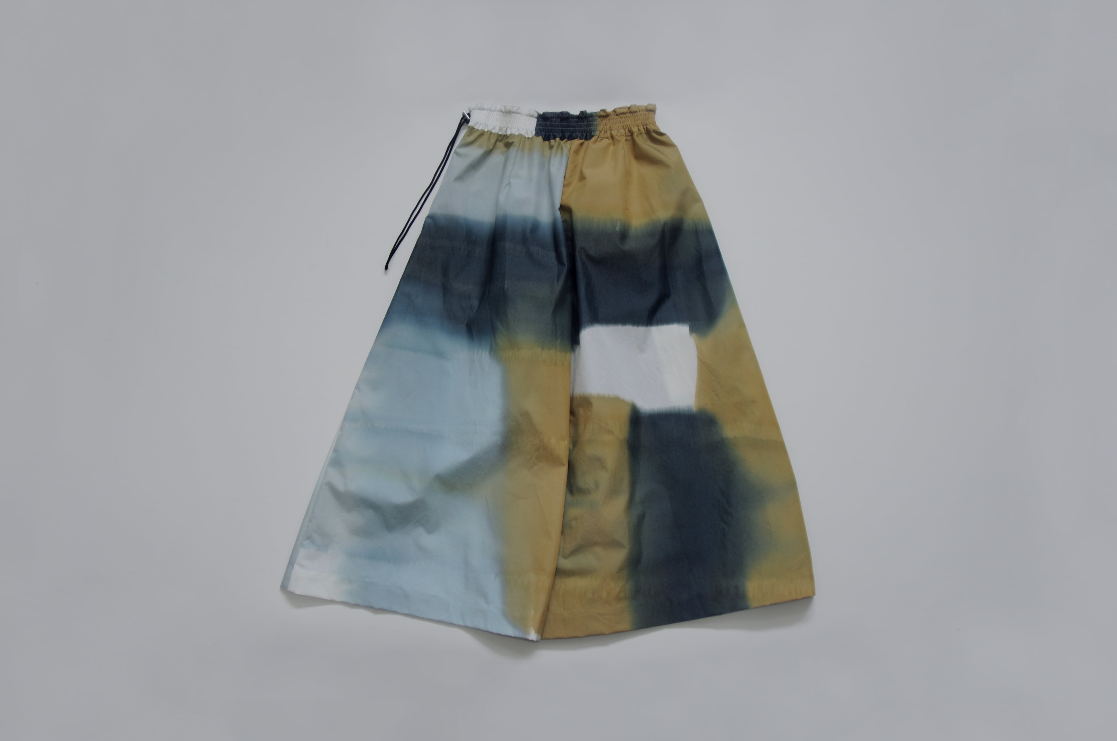綿ナイロン生地に引き染めを施したギャザーパンツ。